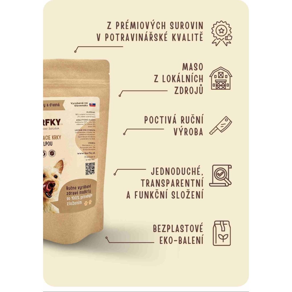 Naše kuřecí krky jsou z ověřených slovenských zdrojů, v potravinářské kvalitě. Kelpa, kterou tyto pamlsky obalujeme, pochází z Norska a je schválena pro použití v krmivářství. Každá várka kelpy je testována na obsah těžkých kovů a toxinů, proto si můžete být jisti, že váš pes dostává tu nejlepší výživu. Kuřecí krky s kelpou mají po vysušení zelenohnědou až hnědou barvu. Změna barvy kelpy ze zelené na zelenohnědou, resp. hnědou souvisí s působením teplého vzduchu. Jde o přirozený jev, který neovlivňuje výživovou hodnotu, a tedy ani kvalitu pamlsku.